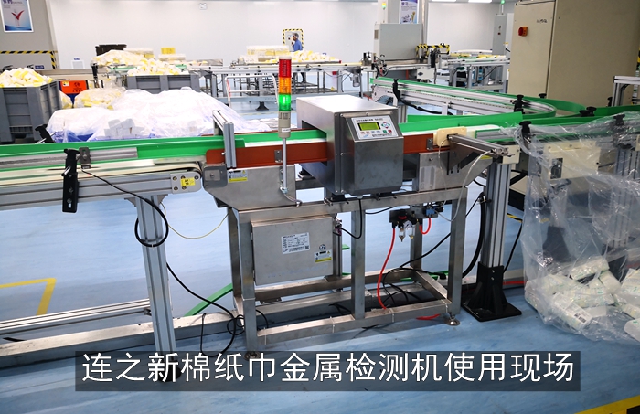湖北天门某医疗用品集团棉质纸巾生产线采用连之新推杆式金检机使用现场