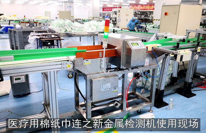 湖北天门某健医疗用品集团棉质纸巾生产线采用连之新推杆式金检机,某健医疗集团是以生产和销售医用敷料及一次性医疗卫生用品,其中包括医疗护理类、伤口护理类、家庭护理类以及自主研发的全棉水刺无纺布四大系列产品。具有国内最完善的医用纱布系列、绷带系列、医用棉、化妆棉系列、全棉无纺布、化纤无纺布系列等生产线,也是国内唯一一家从原材料到最终成品的生产、灭菌、销售和服务的专业化集团公司。在淘汰之前购买的其他品牌金检机后选择了连之新金检机,以提高产品品质和竞争力。
