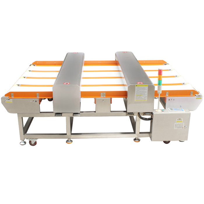 是一台客户定制的双系统探测型数字式金属检测机,整机采用304不锈钢设计制作,并且前探头采用传统检针机制作有位置指示灯功能,第二组探头为全金属检测机系统,可检测出细小的铁、铜、铝、不锈钢等所有金属异物。
