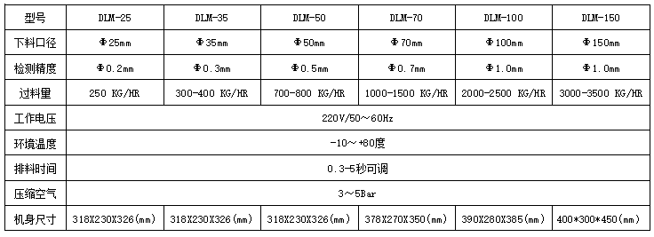 原料从料斗或送料器自由下落进入金属分离器,如果没有金属杂质,原料会直接通过金属分离器流向下端的出料口。如果检测器检测到原料中含有金属,那么控制器立刻启动分离板将金属物和部分原料一起导向侧面的排料口,然后分流板迅速恢复至正常的位置,分流板速度可调,金属分离器的检测精度也可根据生产需要调节,最小可检测并分离出Φ 0.2mm的金属颗粒。