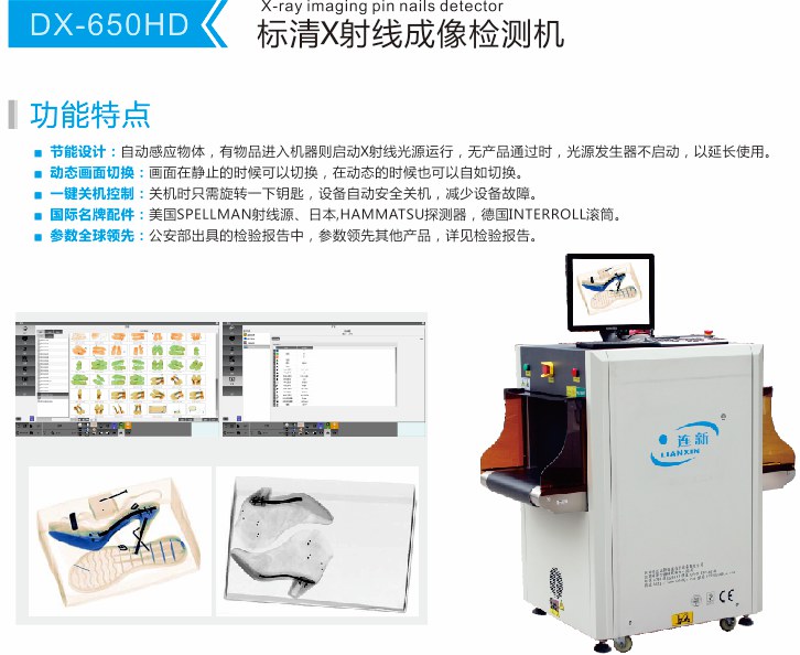DX-650HD X光鞋子验针机,是一款标清的X光验针钉设备,适合用于鞋子手袋箱包等工业生产质量检测场所,是检品环节一款重要的检测仪器。